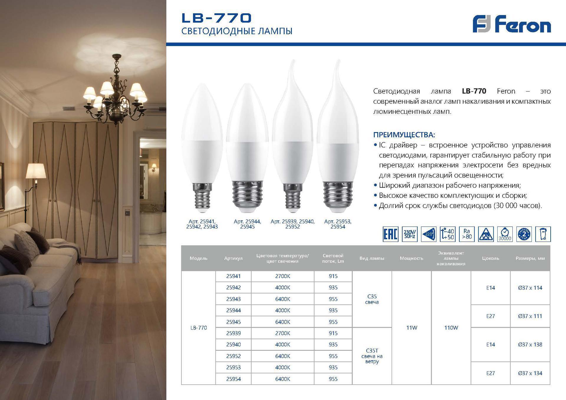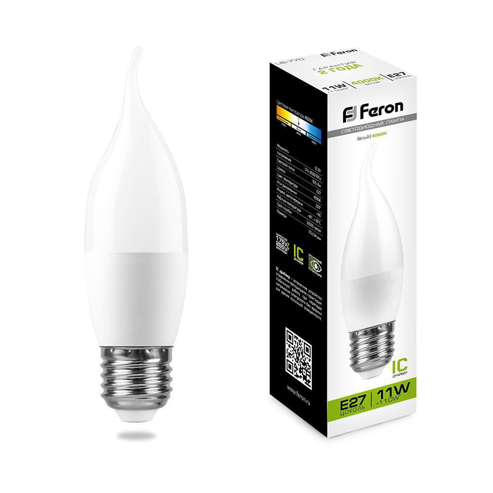 Лампа светодиодная FERON LB-770, C37T (свеча на ветру), 11W 230V E27 4000К (белый), рассеиватель матовый белый, 935Lm, угол рассеивания 220°, 134*37мм