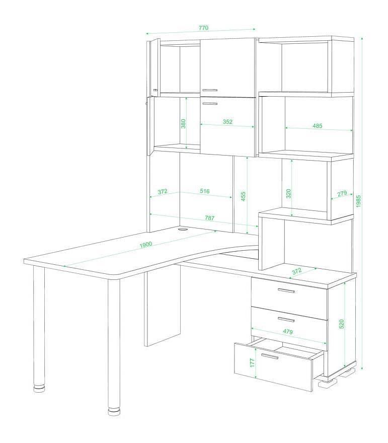 стеллаж:3 ящика,4 дверцы,6 полок