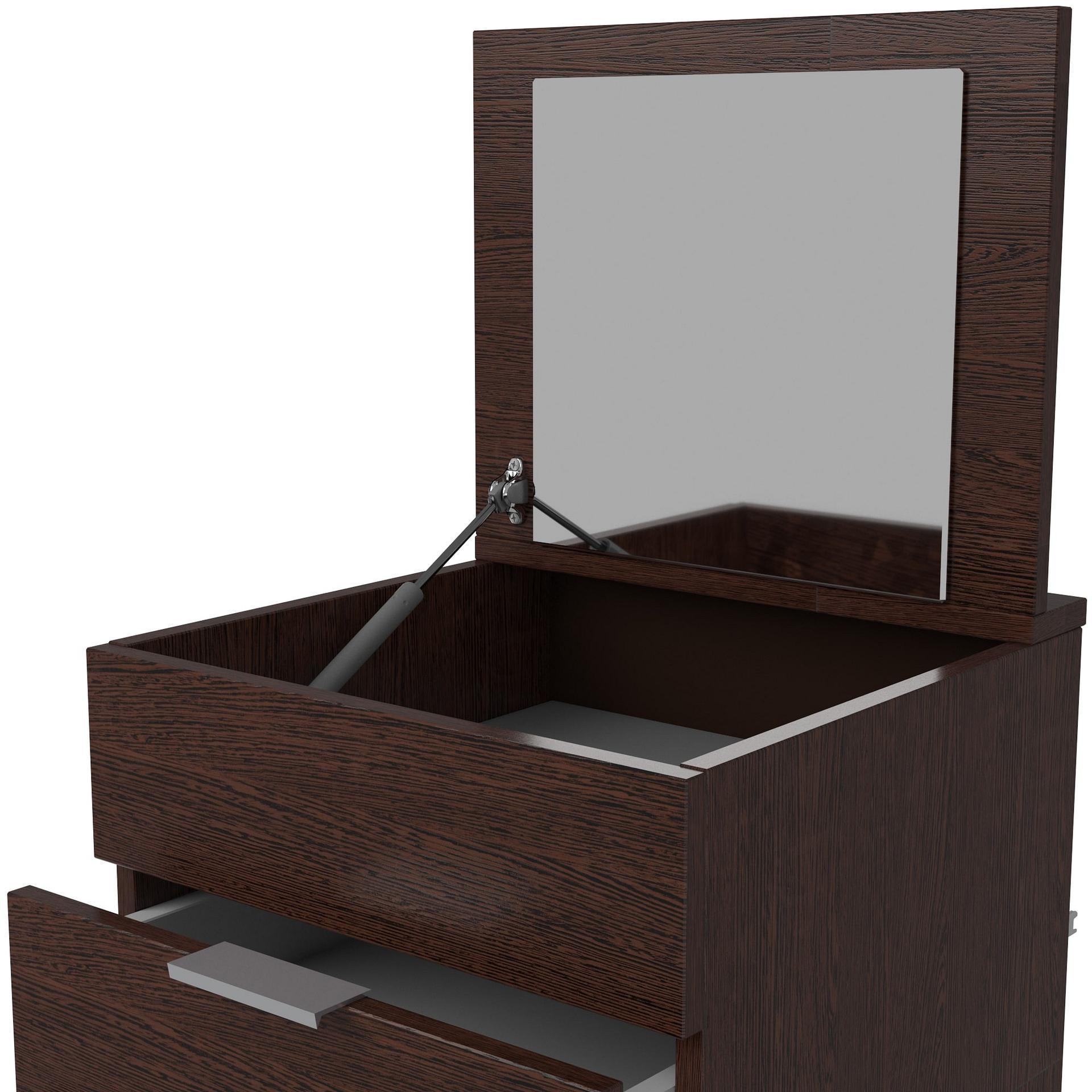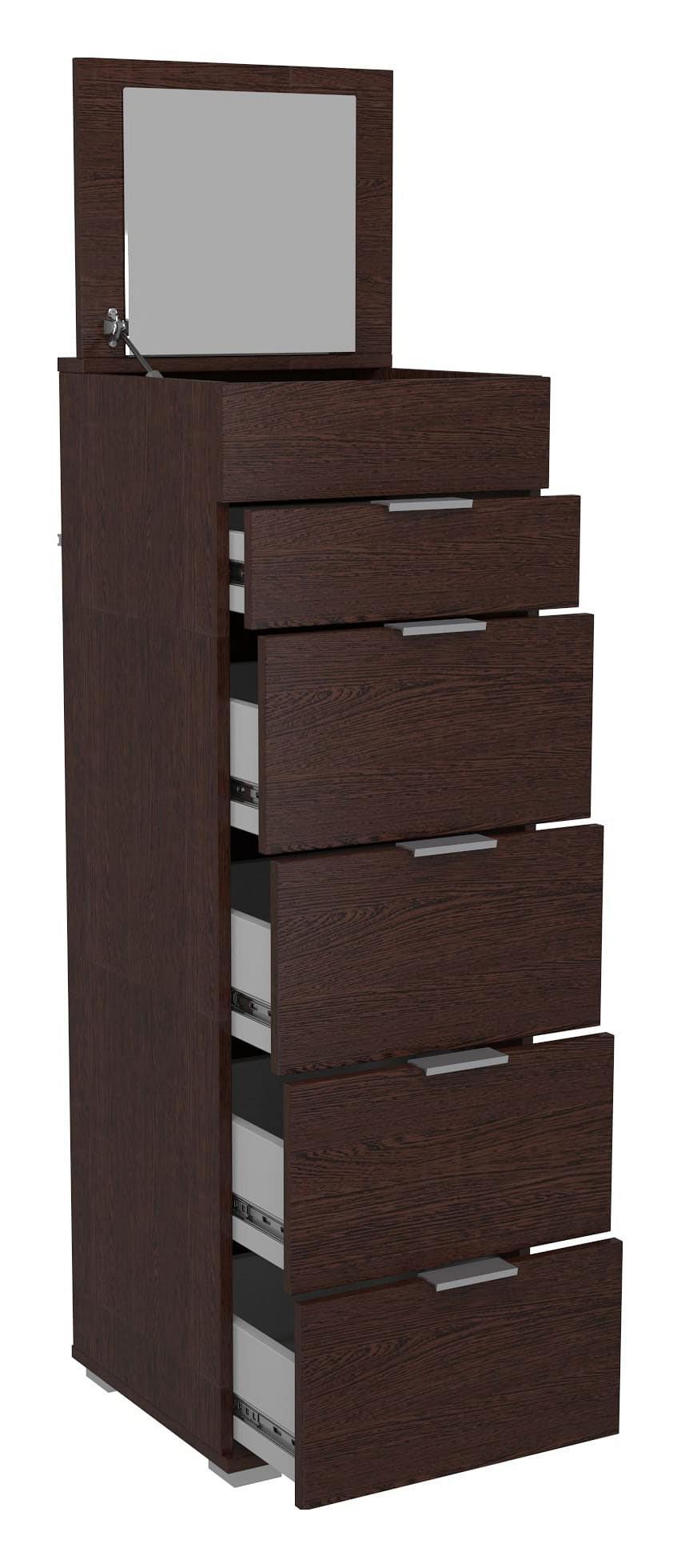 Комод Наоми-6 оснащен пятью выдвижными ящиками и отсеком с откидной крышкой с амортизатором для фиксации. Откидная крышка c зеркалом. Комод очень удобен, так как не занимает много места и совмещает в себе функции комода и трюмо.