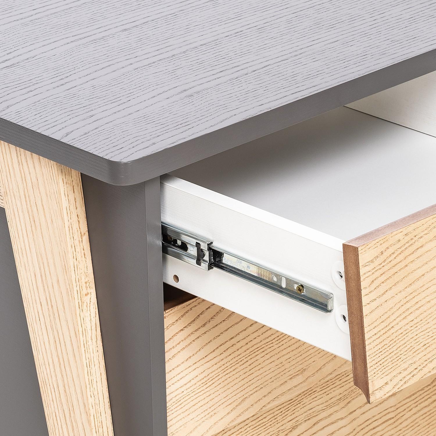 Оригинальная тумбочка отражает современные тенденции стильного интерьера без излишеств. Направляющие и глубокие выдвижные ящики превращают привычный предмет меблировки в практичную составляющую помещения.