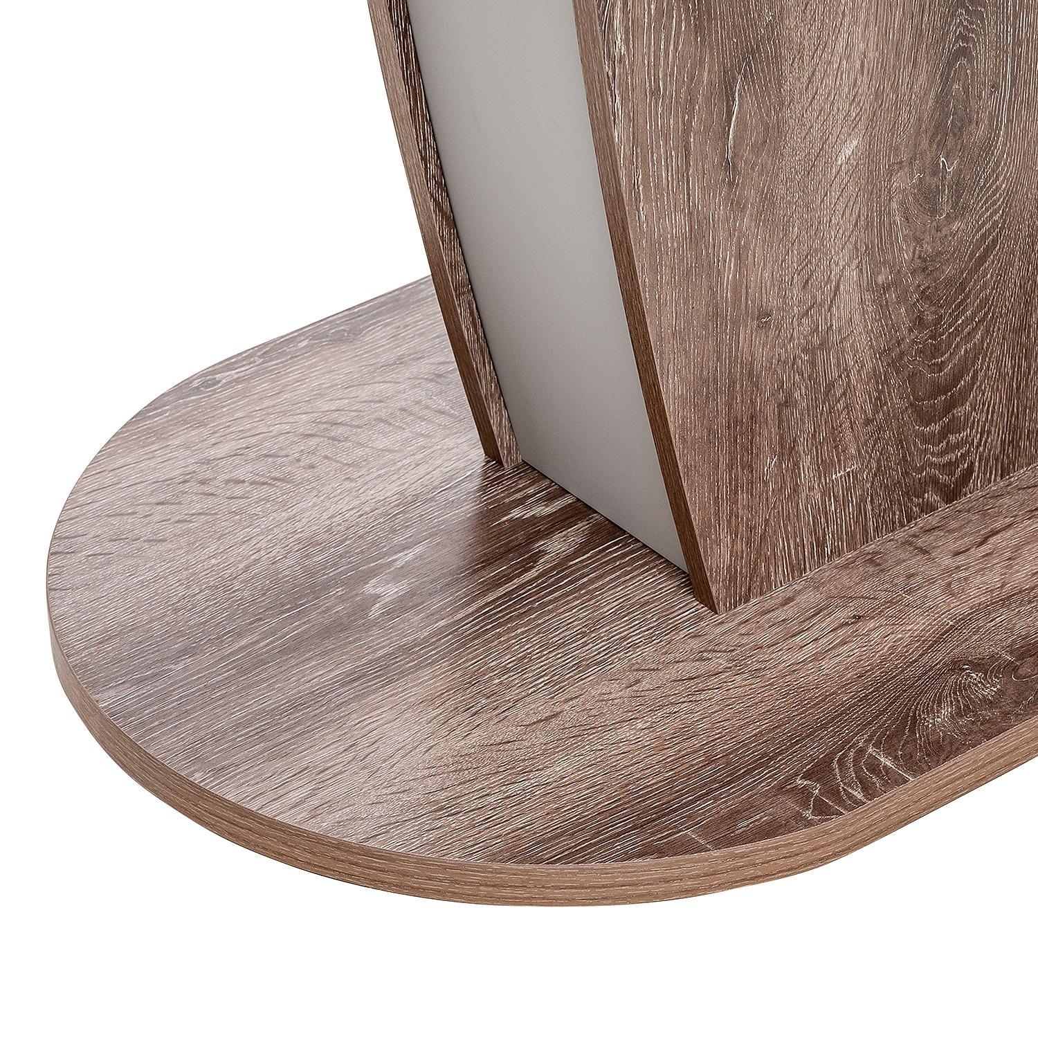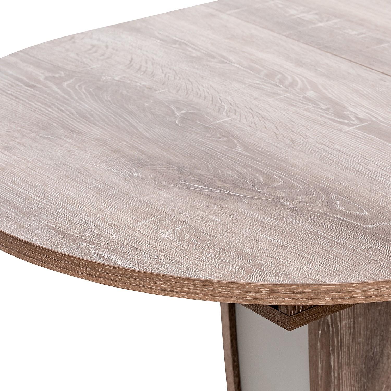 Высококачественная столешница из ЛДСП с имитацией древесного рисунка не выгорает, не боится горячей кухонной утвари и средств бытовой химии (кроме абразивов). За счет массивной опоры круглый обеденный стол на одной ножке устойчивый, не расшатывается и выдерживает распределенную нагрузку до 40 кг.