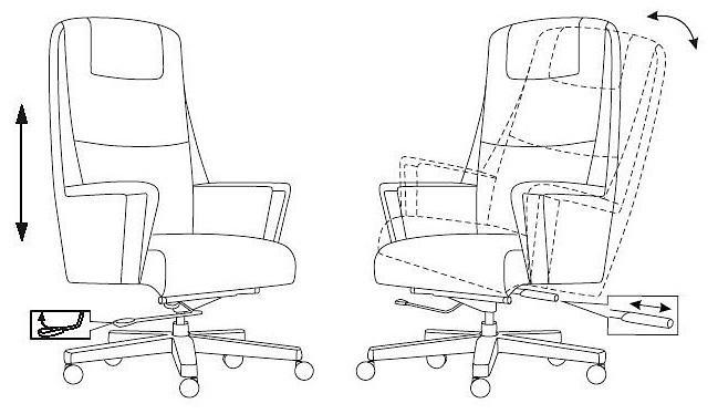 Механизм со смещенной осью качания с возможностью фиксации в вертикальном положении. Регулировка высоты - газлифт. Подлокотники монолитные кожаные. Спинка цельная с сиденьем.