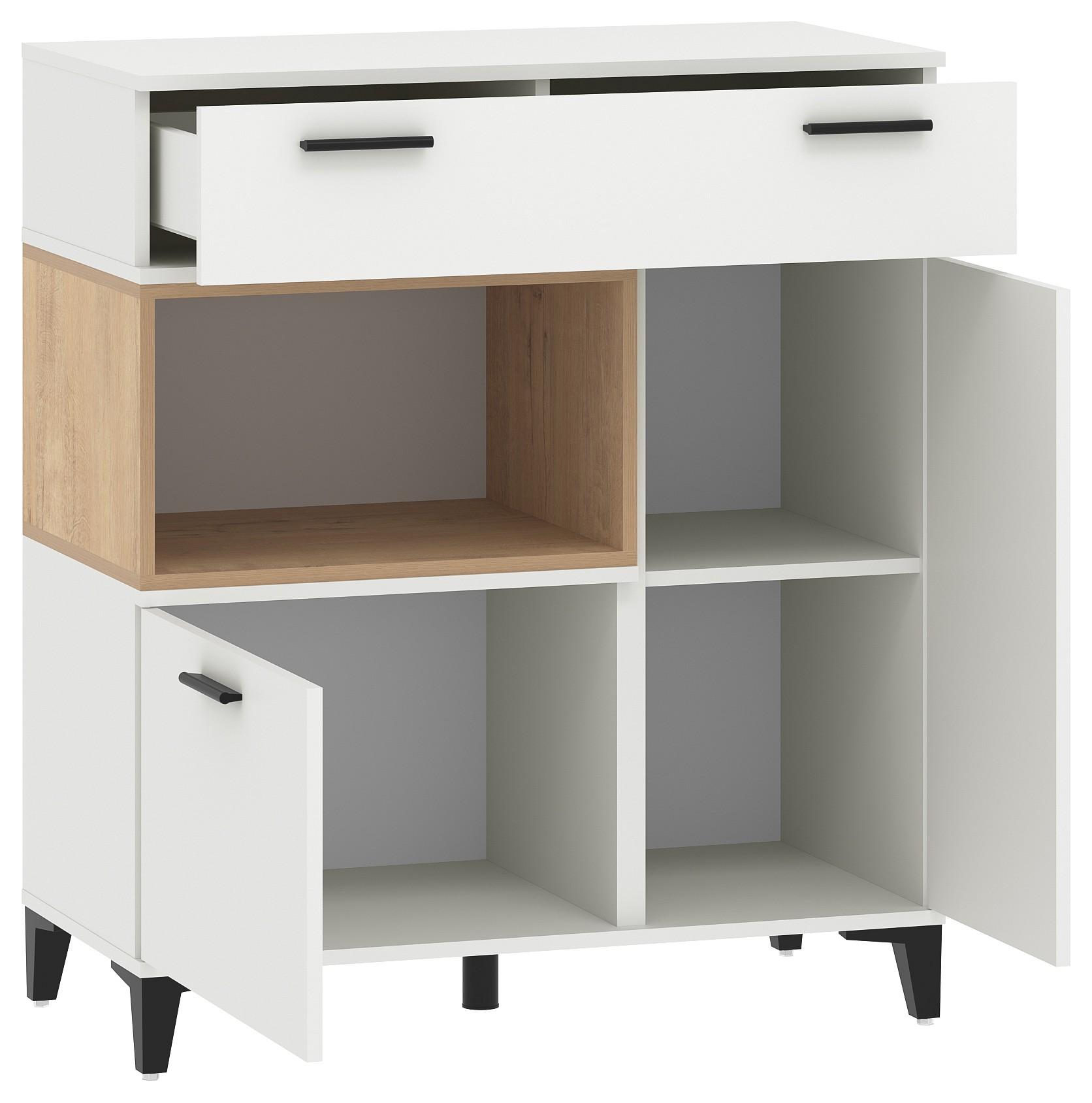 Тумба с выдвижным ящиком на шариковых направляющих, с двумя распашными дверцами и открытой полкой.