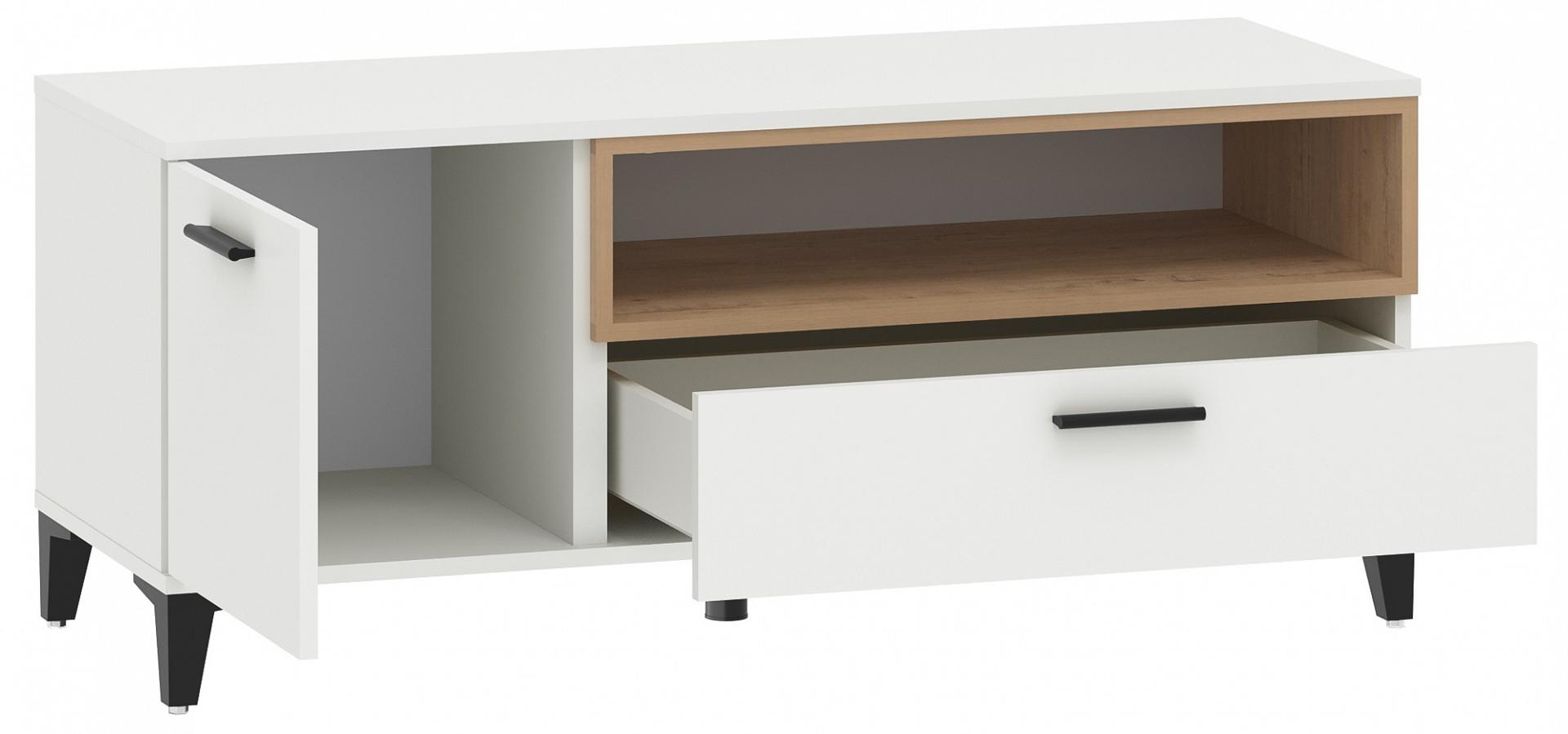 Тумба под ТВ с выдвижным ящиком на шариковых направляющих, с распашной дверцей и открытой полкой. Сборка универсальная.