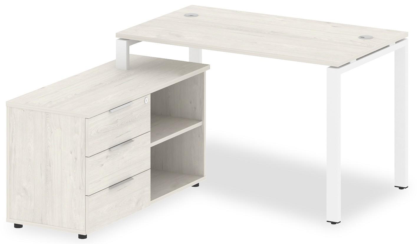 • 3 ящика. Для изготовления корпуса был выбран ЛДСП Е1, металл в оттенке белый, дуб наварра, завершает дизайн матовый верхний слой, гармонично сочетающийся со столешницей. Приобрести данную модель вы можете по привлекательной цене, равной 31463 руб.