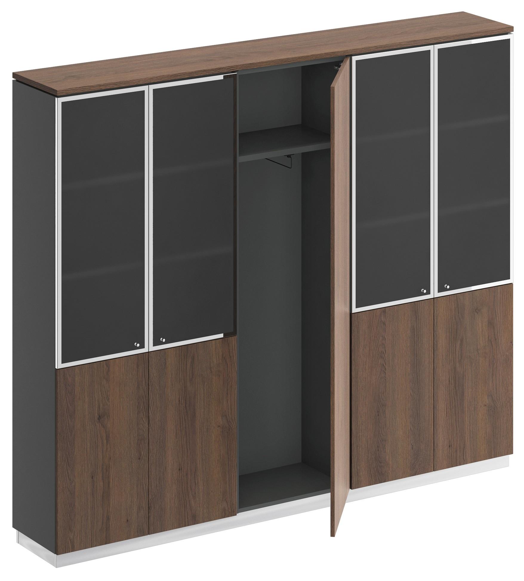 Шкаф состоит из 2-х стеллажей с полками и шкафа для одежды с полками, топа, цоколя и дверей.