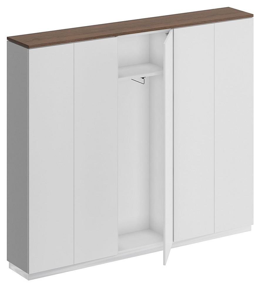 Дизайнерским решением является зазор 8 мм между топом и боковыми стенками корпусом шкафа. Проемы между полками обеспечивают размещение стандартных папок CORONA высотой 320 мм. Шкаф для одежды укомплектован фиксированной по высоте полкой под головные уборы и выдвижной штангой для одежды. Конструктив шкафа для одежды позволяет установить дверь в левом/правом положении. Изделие укомплектовано пятью дверями из ЛДСП без замка с системой открывания Push To Open (без ручек).