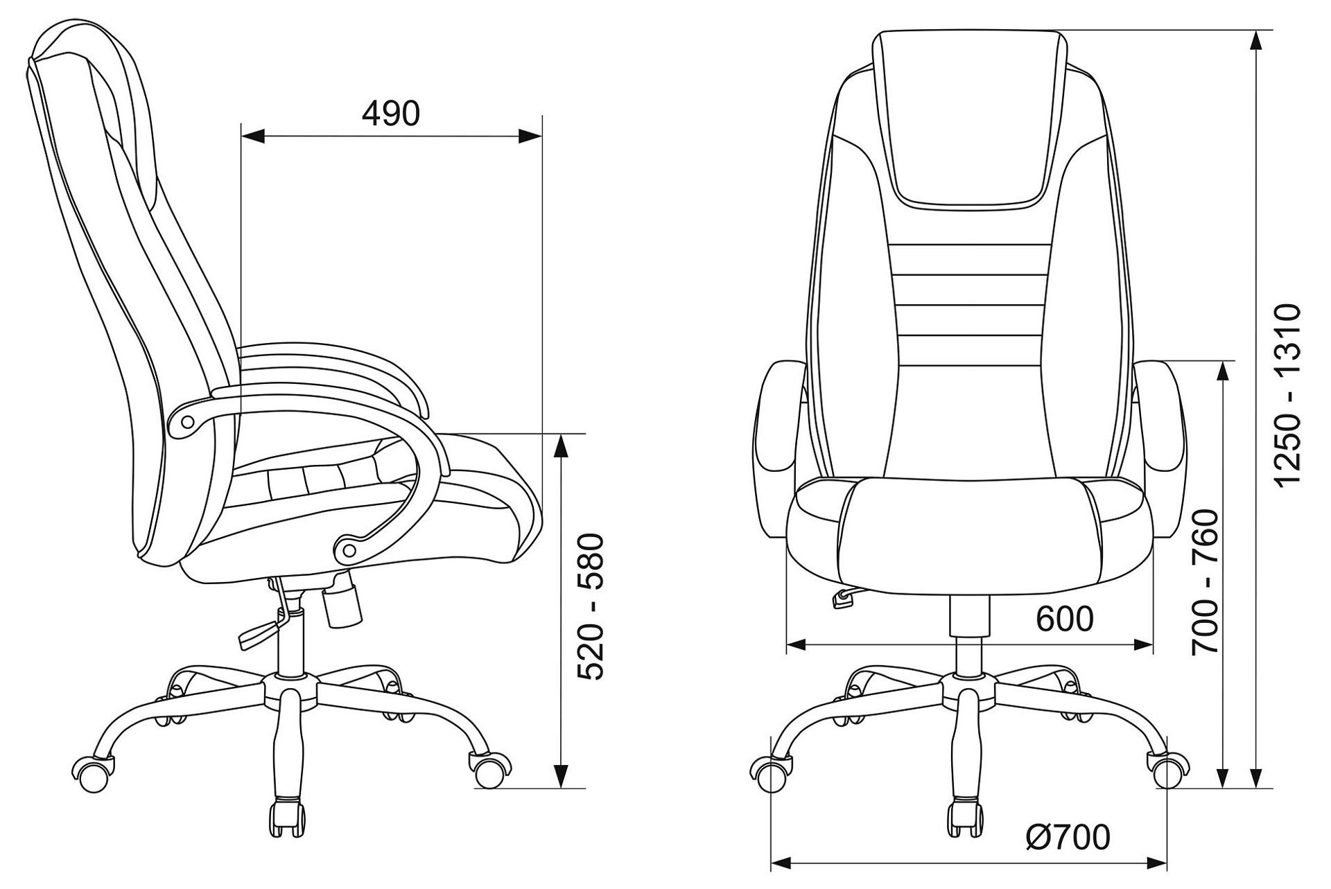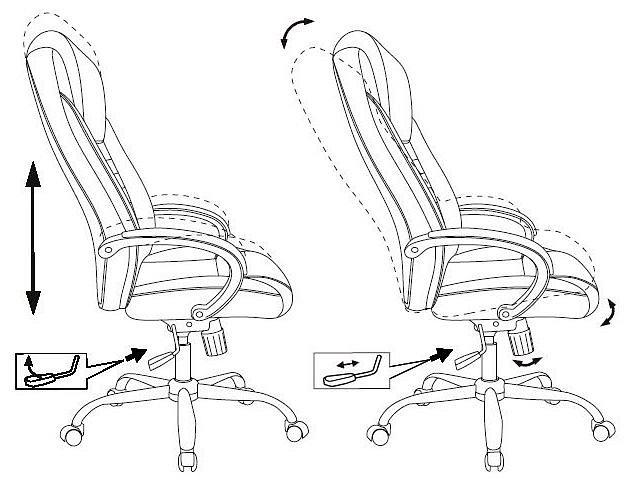 Механизм качания с регулировкой под вес и возможностью фиксации в вертикальном положении. Регулировка высоты (газлифт). Подлокотники пластиковые крашеные с накладками из экокожи. Крестовина металлическая хромированная. Колеса пластиковые.