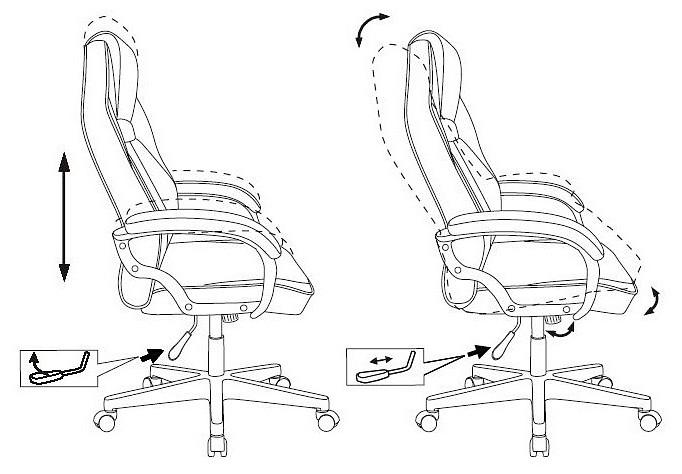 Механизм качания с регулировкой под вес и возможностью фиксации в вертикальном положении. Регулировка высоты - газлифт. Поддержка шеи - тканевая подушка. Подлокотники пластиковые с мягкими накладками.