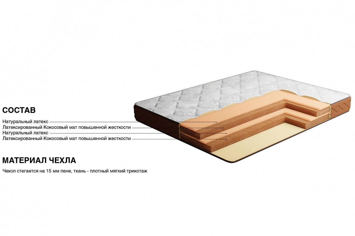 Это жесткий прочный и практически вечный матрас, в основе которого лежит комбинация латексированных кокосовых матов и натурального латекса. Благодаря этим матрасный блок можно считать полностью натуральным. Такой матрас подойдет людям с весом Выше средней или тем кто, предпочитает спать исключительно на жестких и ровных поверхностях. Матрас сохранит свою форму в течение многих лет. Чехол матраса разработан итальянскими дизайнерами, ткань очень приятная на ощупь, но при этом ее достаточно легко чистить, она не впитывает запахи и абсолютно гипоалергенна.