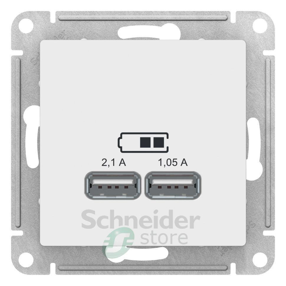 Механизм Schneider Electric AtlasDesign (цвет белый) розетки для зарядки с двумя разъёмами USB с выходными напряжением 5 В постоянного тока и выходами с номинальным током по 2,1 А.
