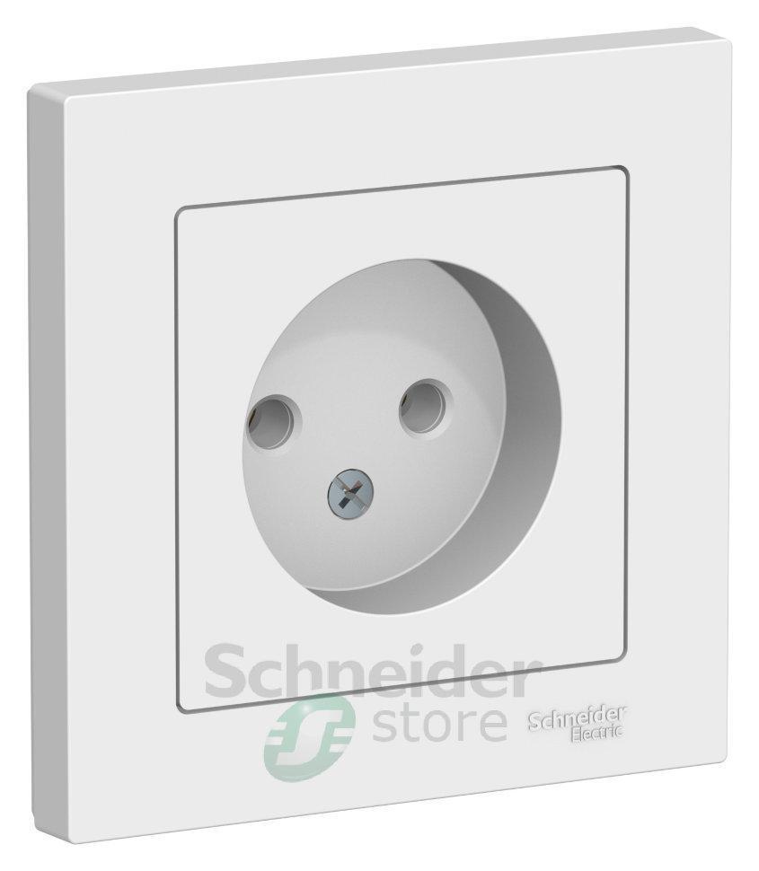 Розетка Schneider Electric AtlasDesign (в сборе, цвет белый) одинарная без заземления и без шторок подходит для сетей 250 В, на ток 16 А.
