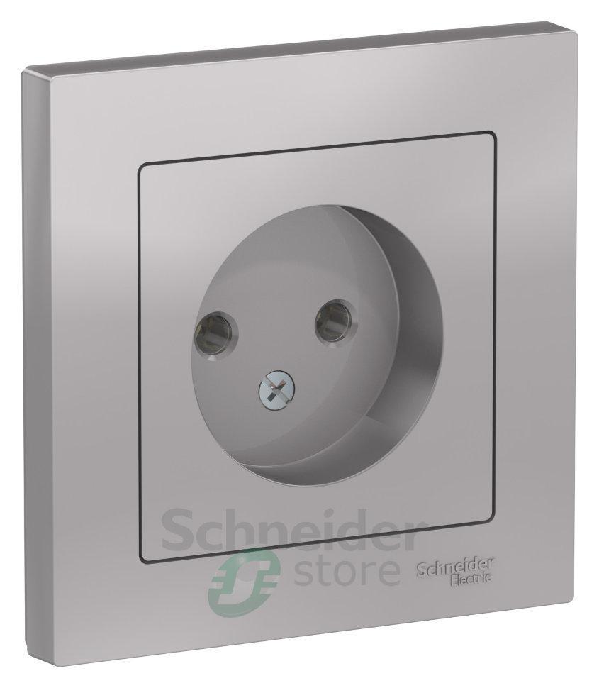 Розетка Schneider Electric AtlasDesign (в сборе, цвет алюминий) одинарная без заземления и без шторок подходит для сетей 250 В, на ток 16 А.