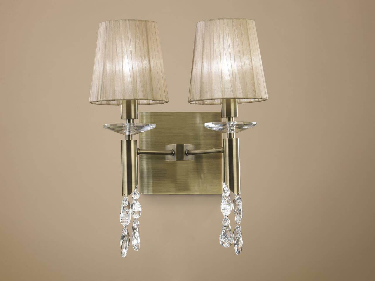Несравненная модель 3883 от испанской компании Mantra относится к коллекции Tiffany и отлично подойдет для установки на стену в гостиной, оформленной . Бра Mantra Tiffany Bronze 3883 с конусными плафонами осветит помещение площадью 5.2 кв. м. Производитель Mantra рекомендует использовать для устройства энергосберегающие лампы с цоколем E14 и мощностью 13 W. Прибор произведен с использованием материалов: текстиль, металл и органза. Основным цветом товара является бежевый и бронзовый. Торопитесь сделать заказ в интернет-магазине SvetONe.