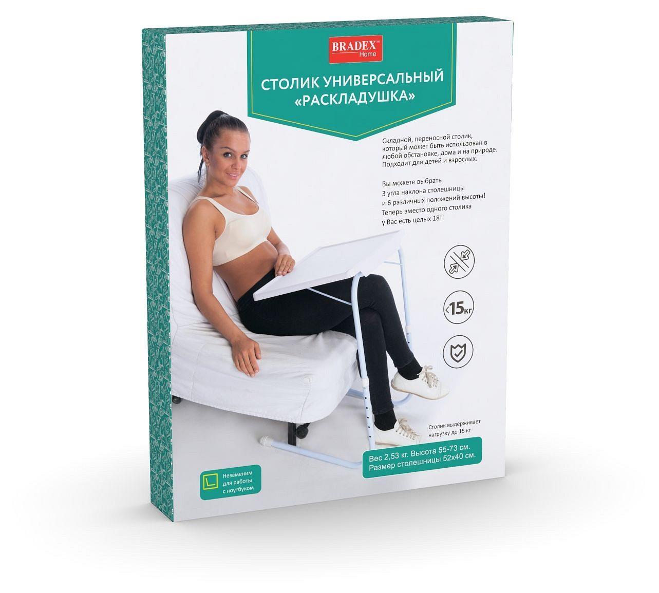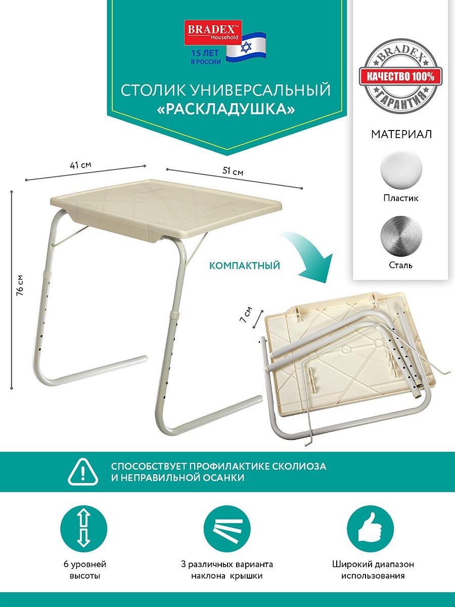 Складной столик РАСКЛАДУШКА имеет 6 уровней высоты и более 3 различных варианта наклона крышки. Изготовлен из полипропилена и стали с напылением.