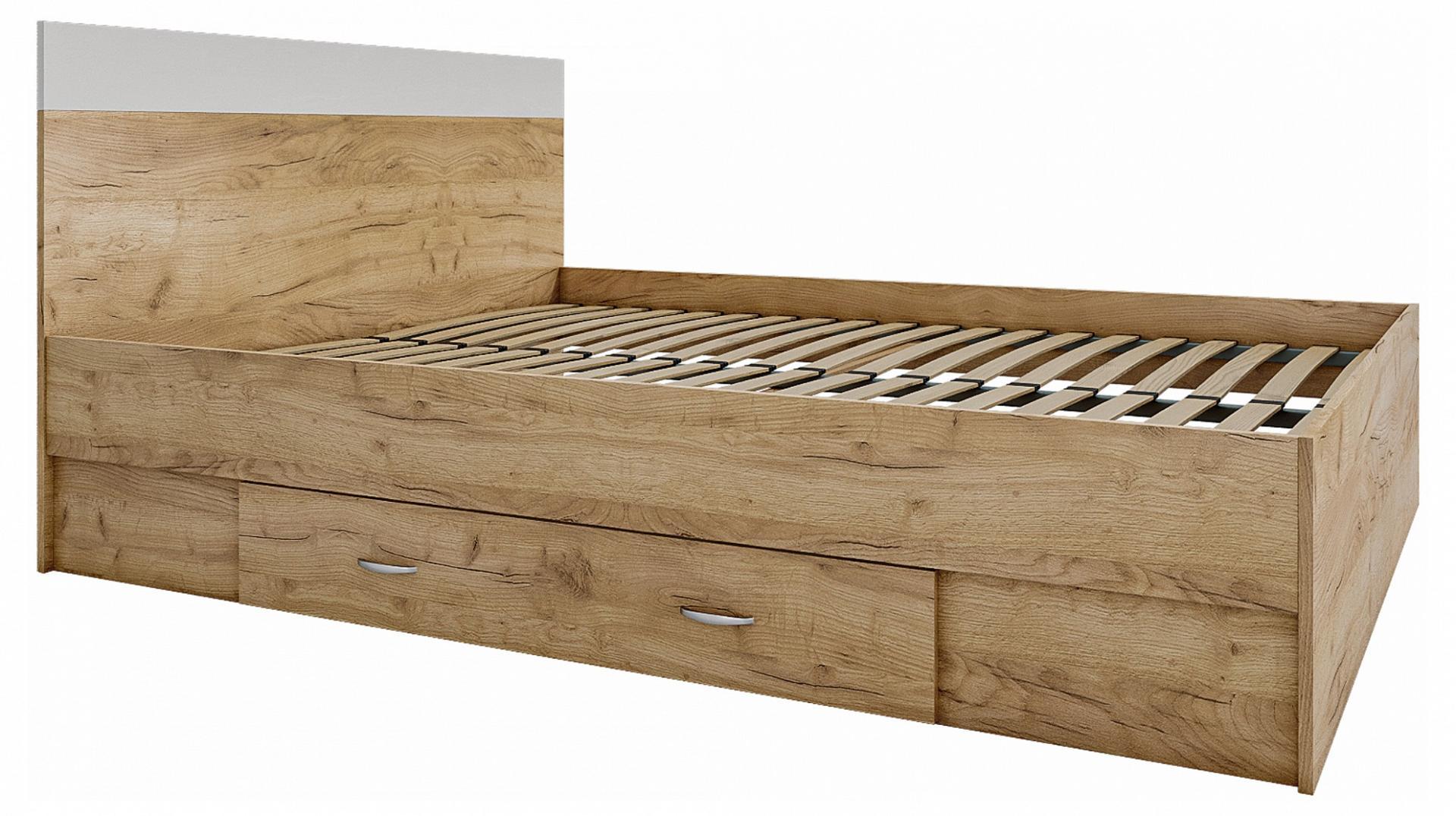 Изголовье кровати выполнено с сочетанием двух текстур – дуб золотой и белый.