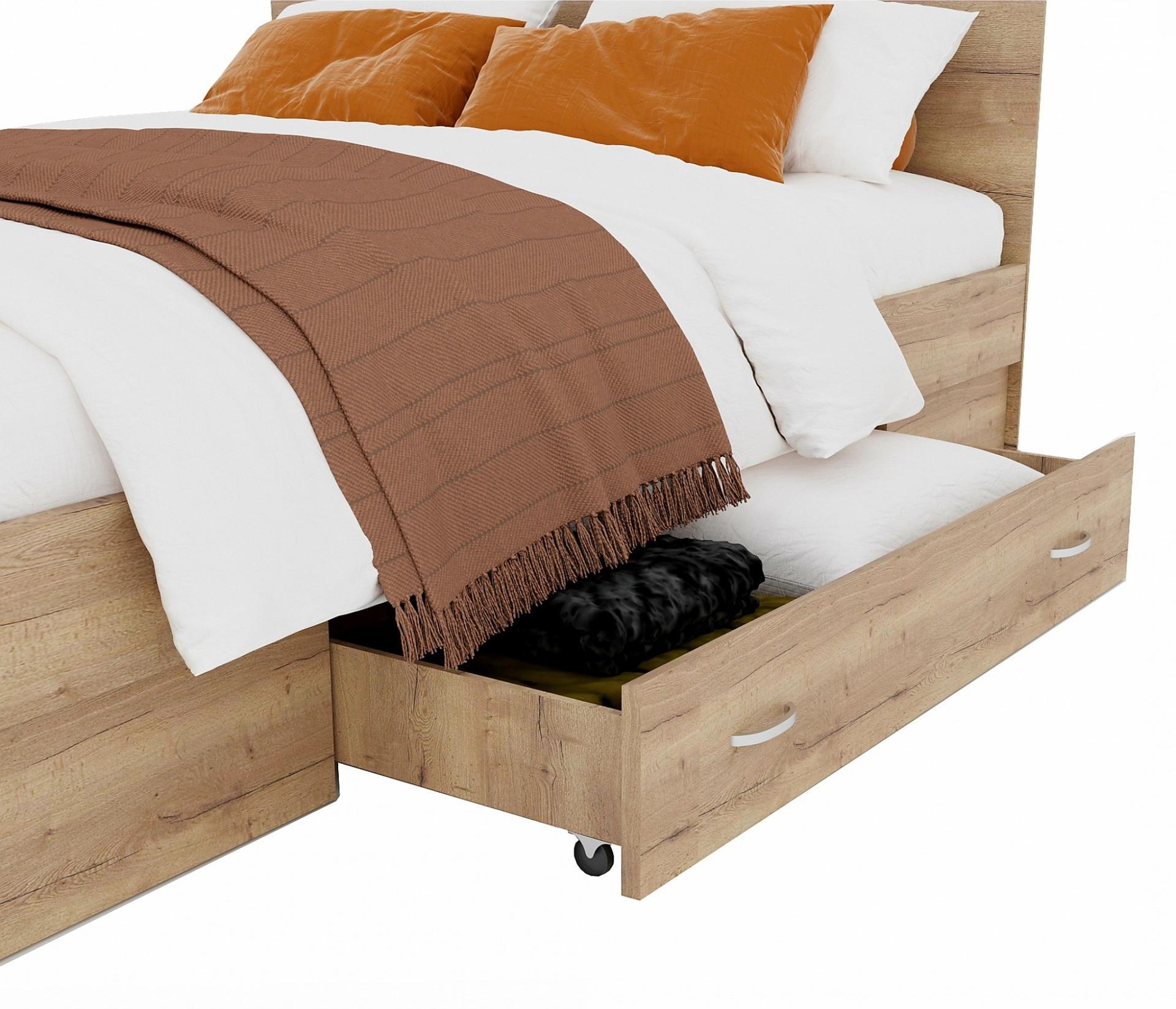 Кровать укомплектована двумя выдвижными ящиками. Ящик в спальном месте – рациональное решение для хранения вещей не первой необходимости. Ящики располагаются по одному с каждой стороны.