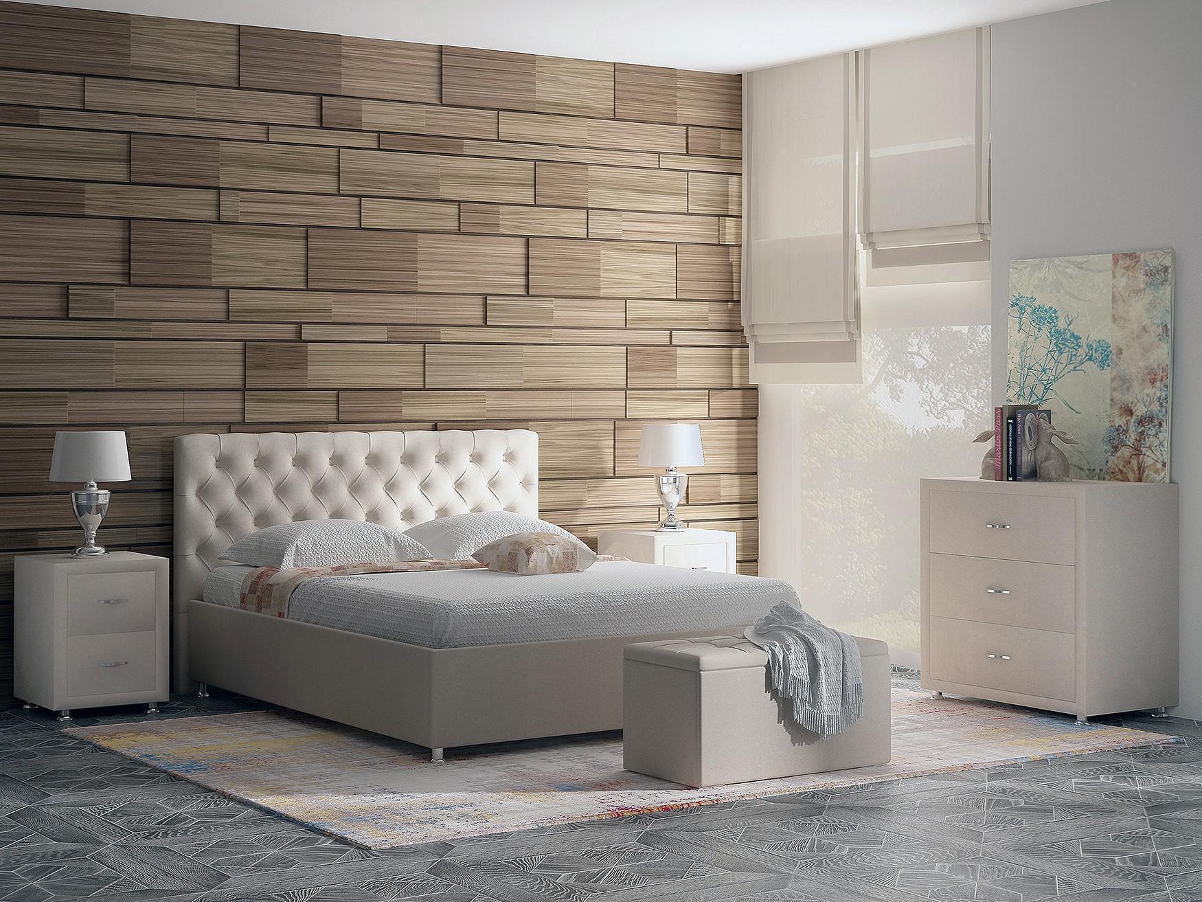 Элегантная интерьерная кровать с изголовьем, украшенным декоративными пуговицами и глубокой пиковкой. В комплект кровати входит кроватное основание. Каркас основания выполнен из металла, ламели - из берёзы.