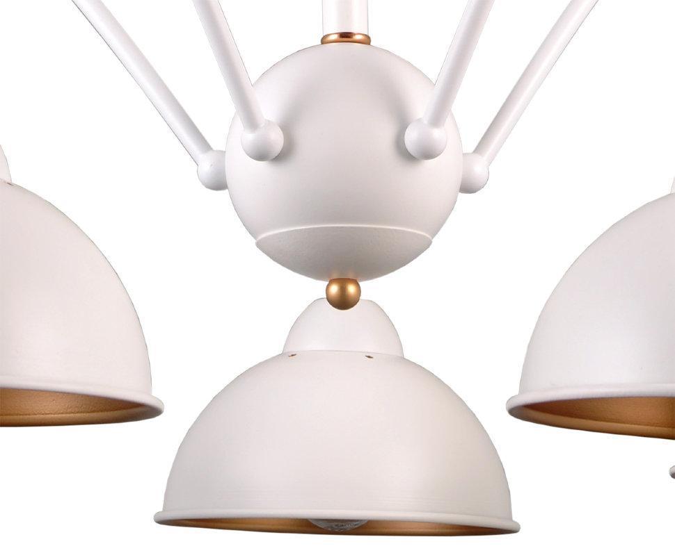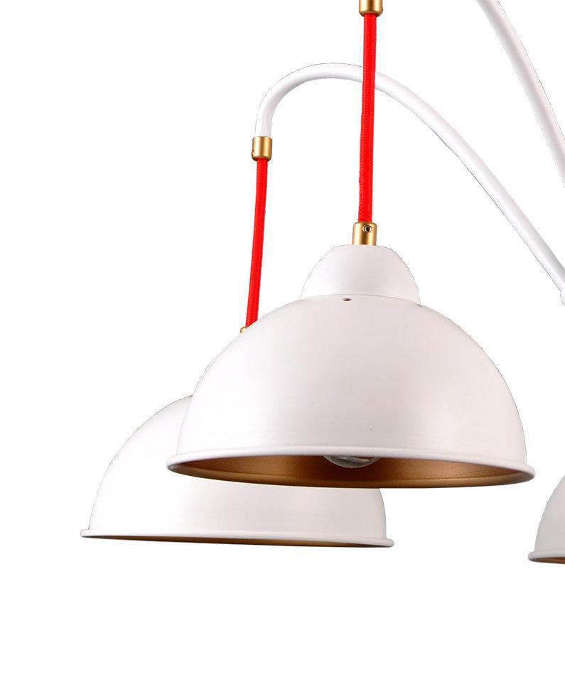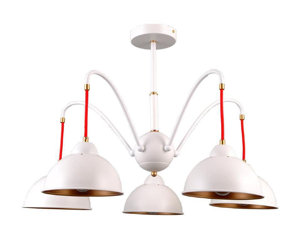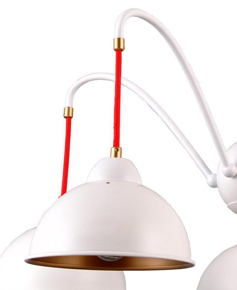 ДЖУЛИЯ. Основа люстры и плафонов - металл белого цвета. Благодаря именно такой форме плафонов световой поток направлен строго вниз, внутренне золотое покрытие мягко отражает свет, а общий дизайн люстры создает легкую, незримую иллюзию движения. Яркое и неординарное дополнение шнуры красного цвета. Акцент Вашему дому обеспечен.