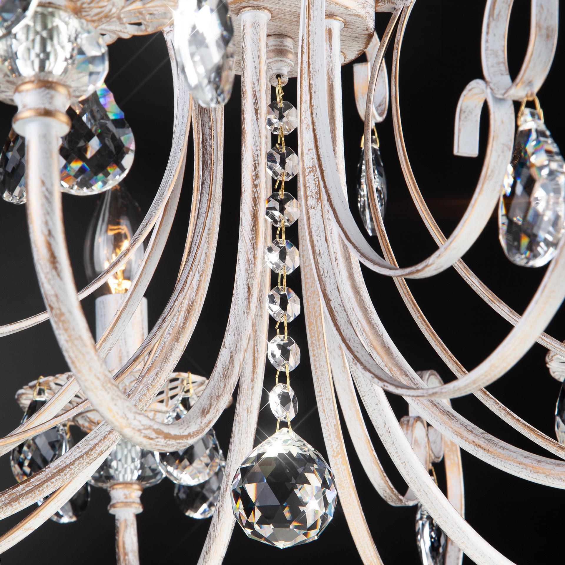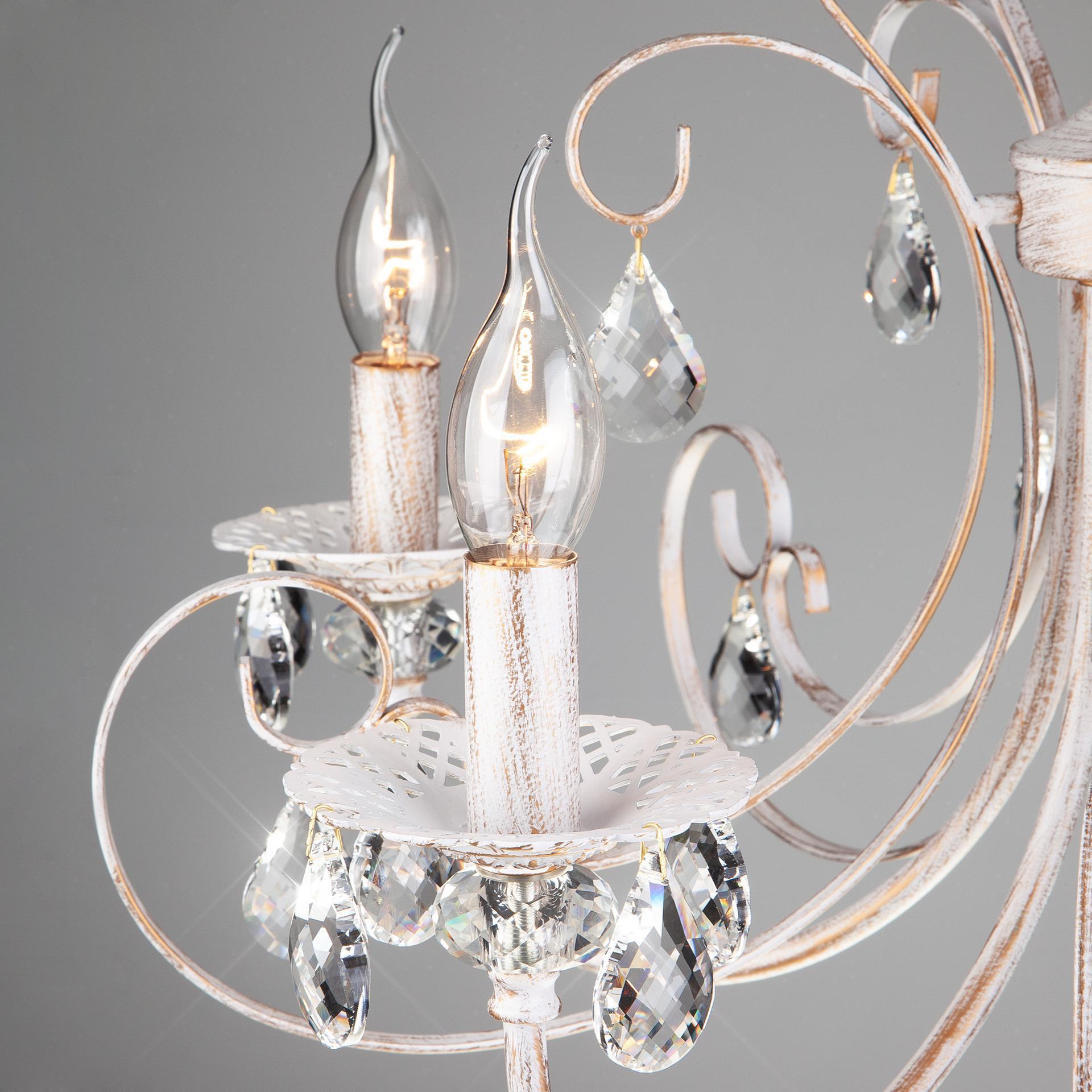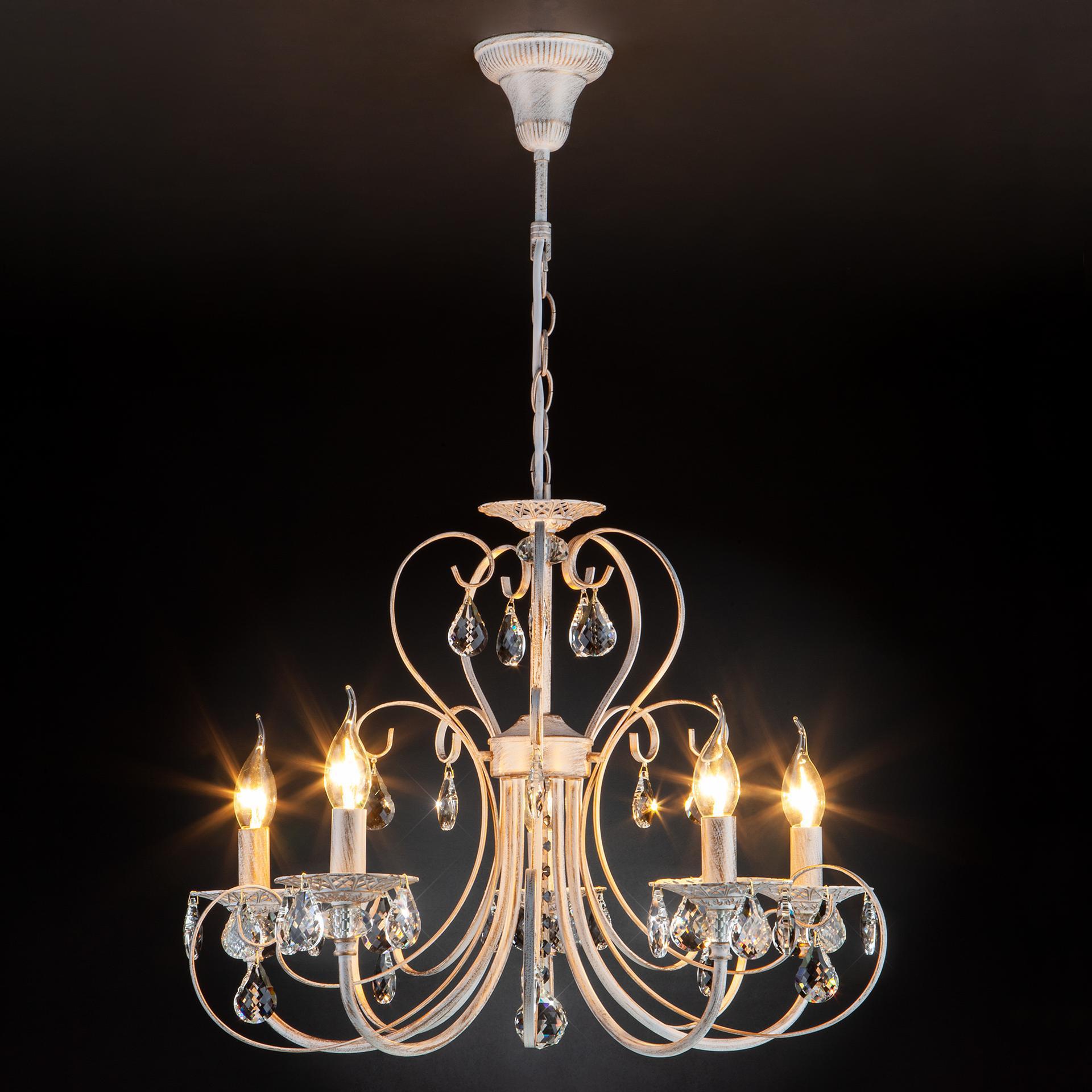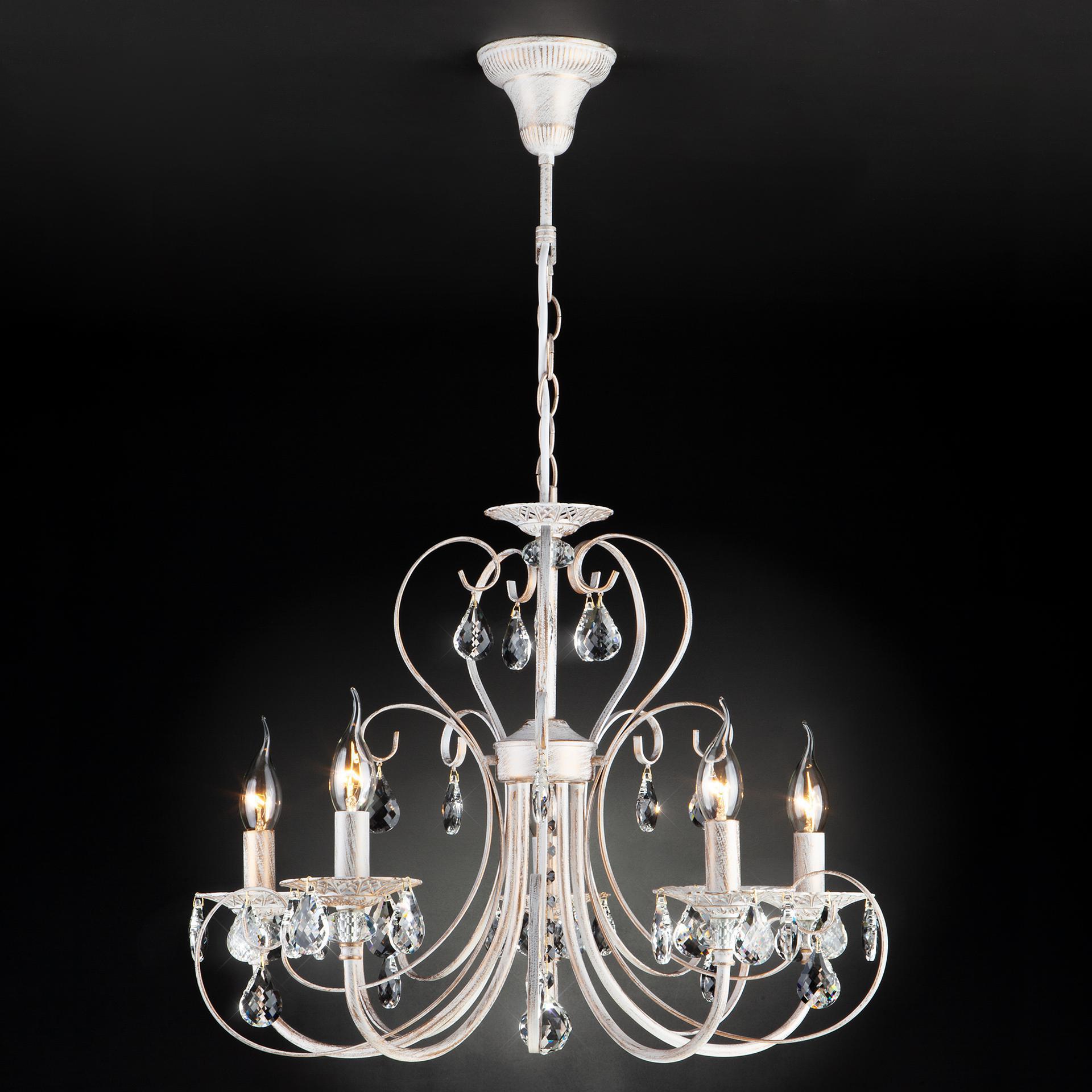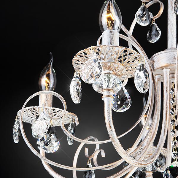 Классическая хрустальная люстра на 5 рожков в цвете белый с золотом / тонированный хрусталь преобразит потолочное пространство и создаст в вашем помещении комфортное полноценное освещение на площади 16 м кв. Изящные формы и классический стиль добавят вашей гостиной утонченного аристократизма. Декоративные рожки в виде подсвечников, украшенные сменными лампами с цоколем E14 типа свеча на ветру переливаются на свету яркими завораживающими бликами. В производстве подвесной люстры использовали особое стекло с эффектной огранкой и высококачественный металл с надежным защитным покрытием. В нашем интернет-магазине вы можете купить подвесную хрустальную люстру по выгодной цене с доставкой по Москве и России.