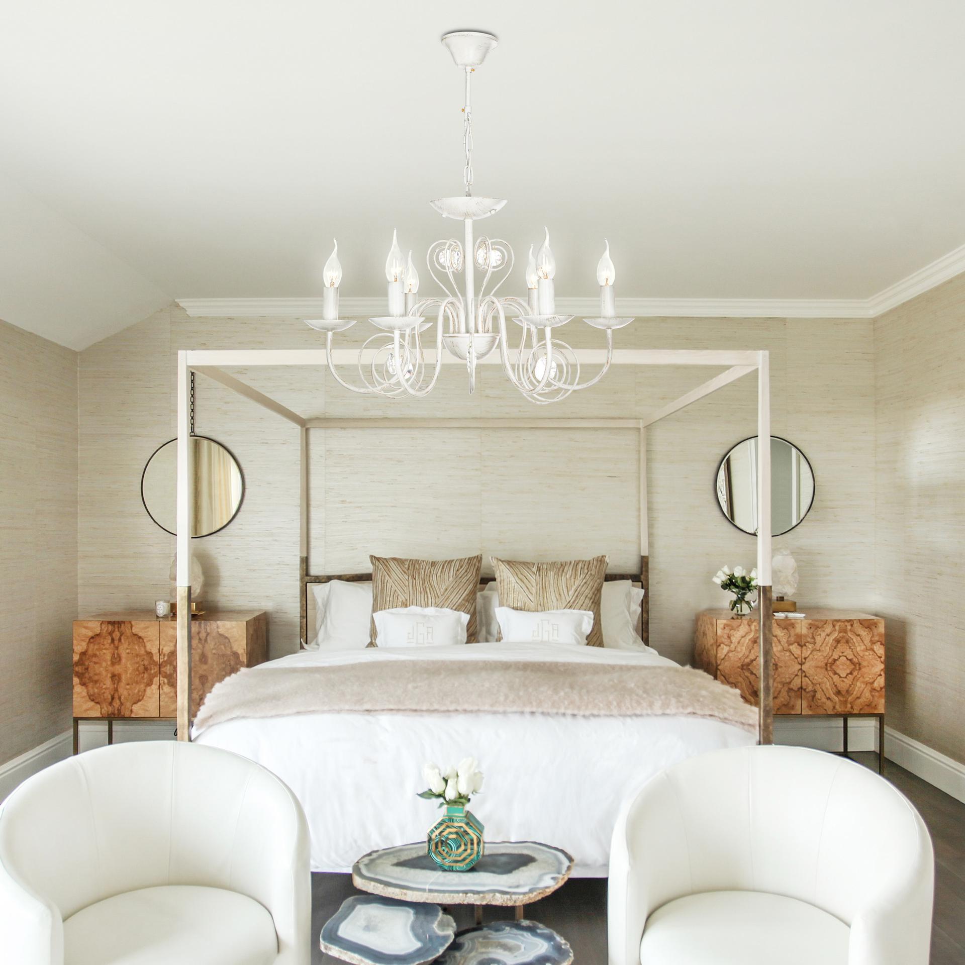 Классическая люстра с хрусталем на 6 рожков в цвете белый с золотом преобразит потолочное пространство и создаст в вашем помещении комфортное полноценное освещение на площади 29 м кв. Изящные формы и классический стиль добавят вашей гостиной утонченного аристократизма. Декоративные рожки в виде подсвечников, украшенные сменными лампами с цоколем E14 типа "свеча на ветру" переливаются на свету яркими завораживающими бликами. В производстве подвесной люстры использовали особое стекло с эффектной огранкой и высококачественный металл с надежным защитным покрытием. В нашем интернет-магазине вы можете купить подвесную хрустальную люстру по выгодной цене с доставкой по Москве и России.