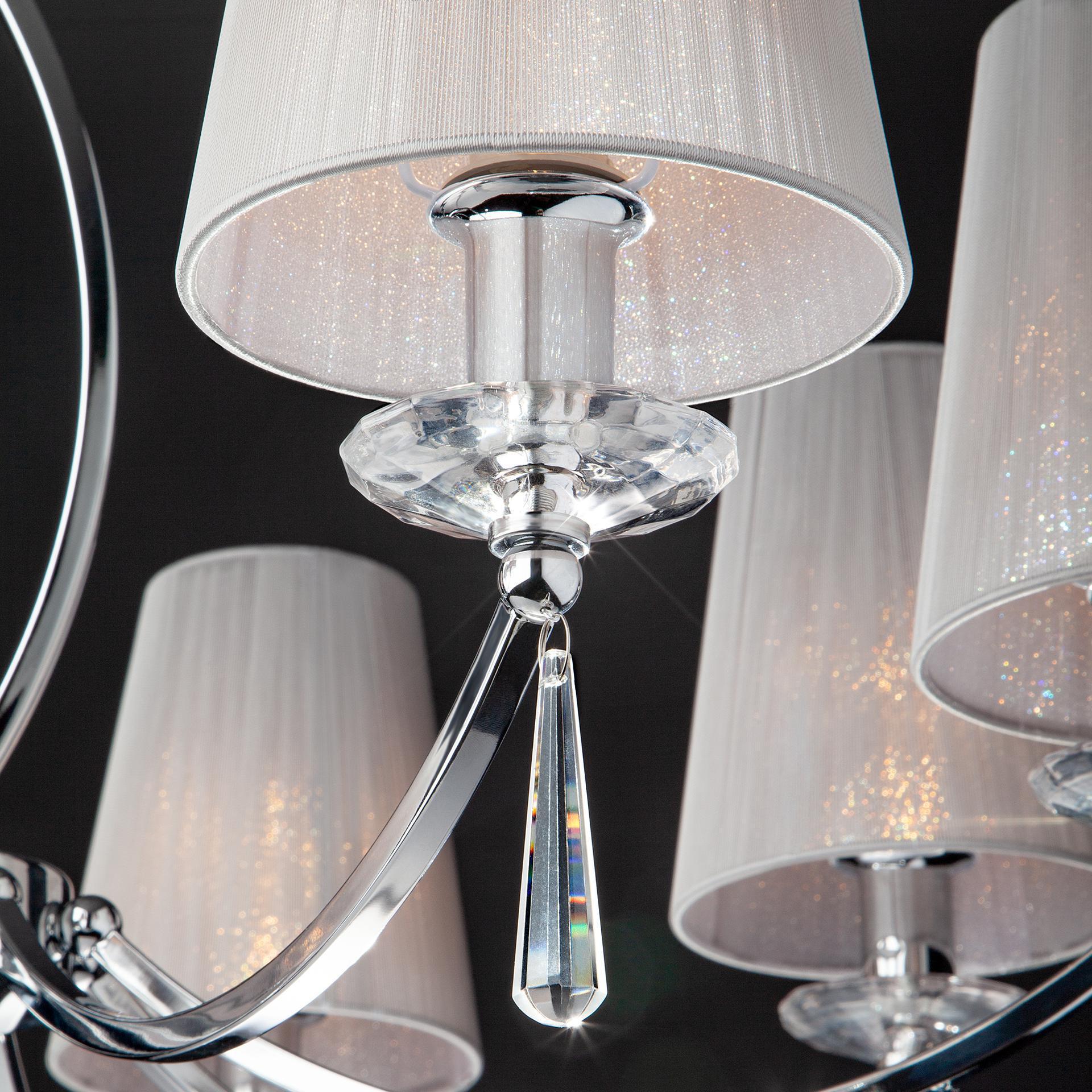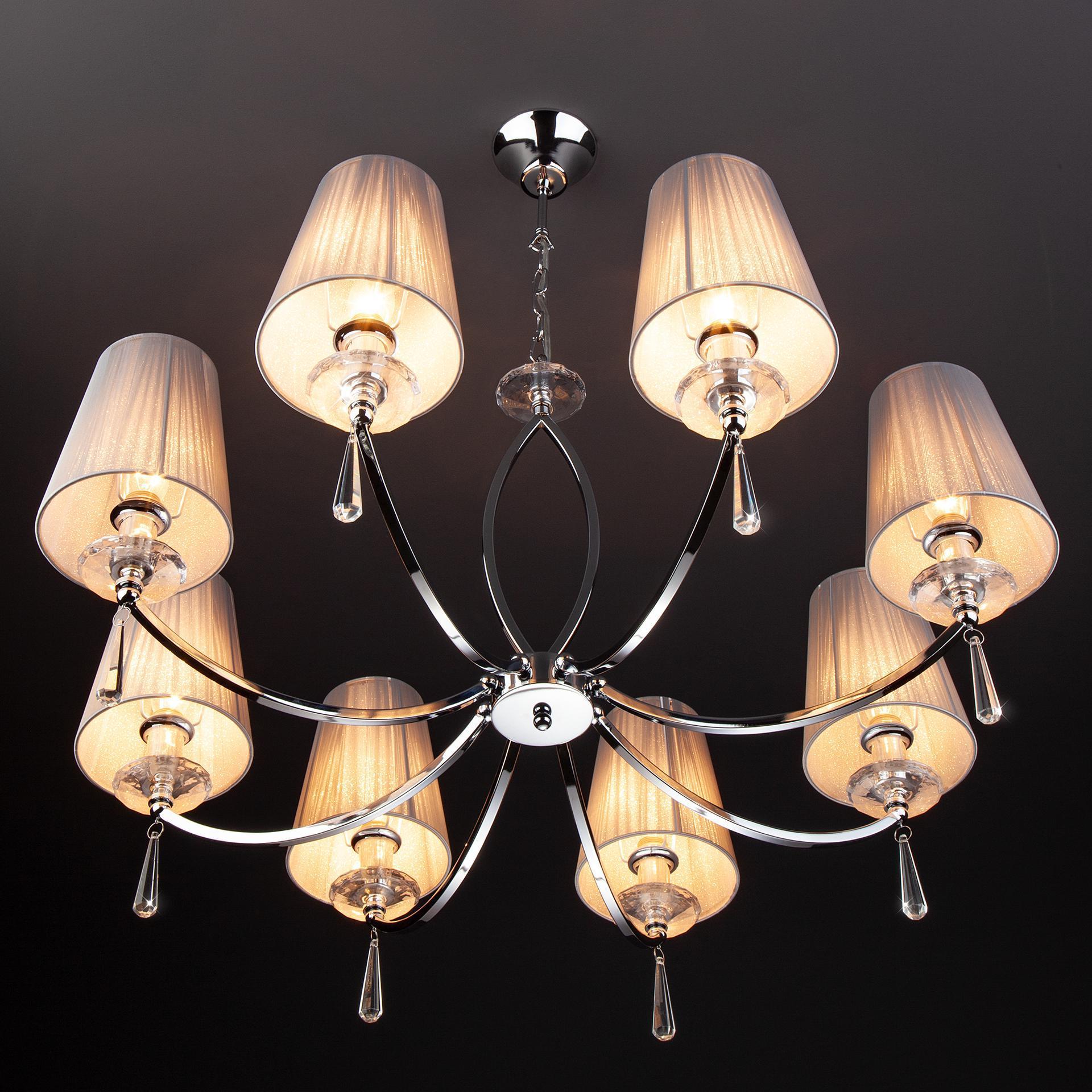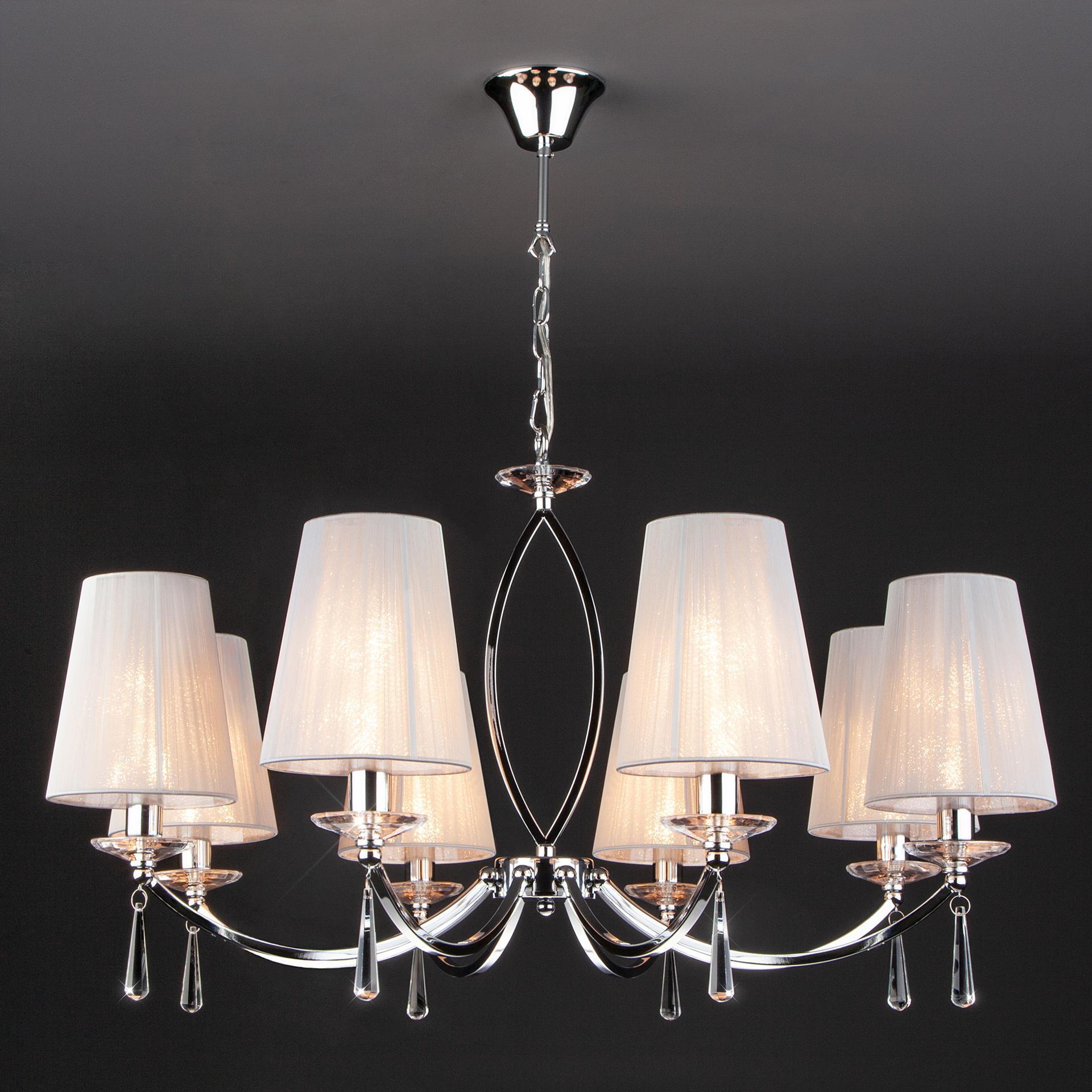 Подвесная люстра на 8 рожков цвета хром предназначена для создания основного освещения в современных и классических интерьерах, подходит для различных типов помещений: гостиная, спальня и рассчитана на площадь освещения 21 м². Роскошная люстра оснащена патронами с цоколем Е14, которые рассчитаны на максимальную мощность ламп 40 Вт. Люстра украшена эффектным декором из хрусталя и дополнена выразительными тканевыми абажурами. Арматура изготовлена из высококачественного металла с надежным защитным покрытием. В нашем интернет-магазине вы можете купить подвесную люстру по выгодной цене.