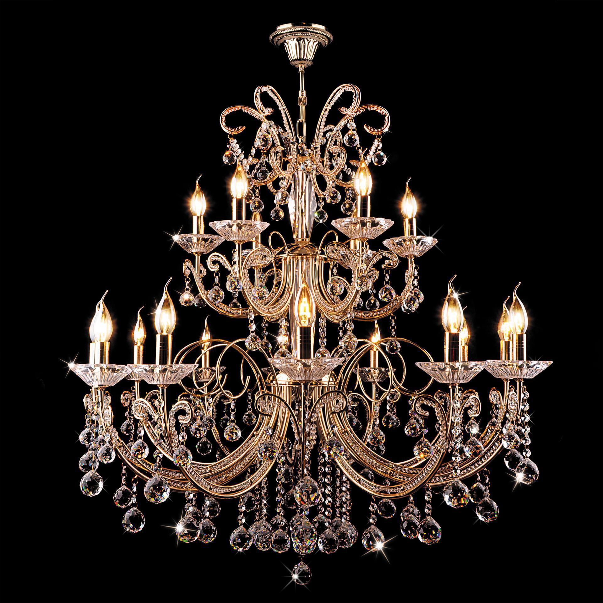 Классическая хрустальная люстра на 18 рожков в цвете золото преобразит потолочное пространство и создаст в вашем помещении комфортное полноценное освещение на площади 50 м кв. Изящные формы и классический стиль добавят вашей гостиной утонченного аристократизма. Декоративные рожки в виде подсвечников, украшенные сменными лампами с цоколем E14 типа свеча на ветру переливаются на свету яркими завораживающими бликами. В производстве подвесной люстры использовали особое стекло с эффектной огранкой и высококачественный металл с надежным защитным покрытием. В нашем интернет-магазине вы можете купить подвесную хрустальную люстру по выгодной цене с доставкой по Москве и России.