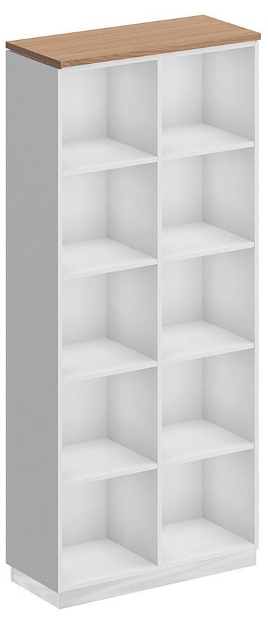 Стеллаж состоит из каркаса с полками, цоколя, топа и двух декоративных вставок.