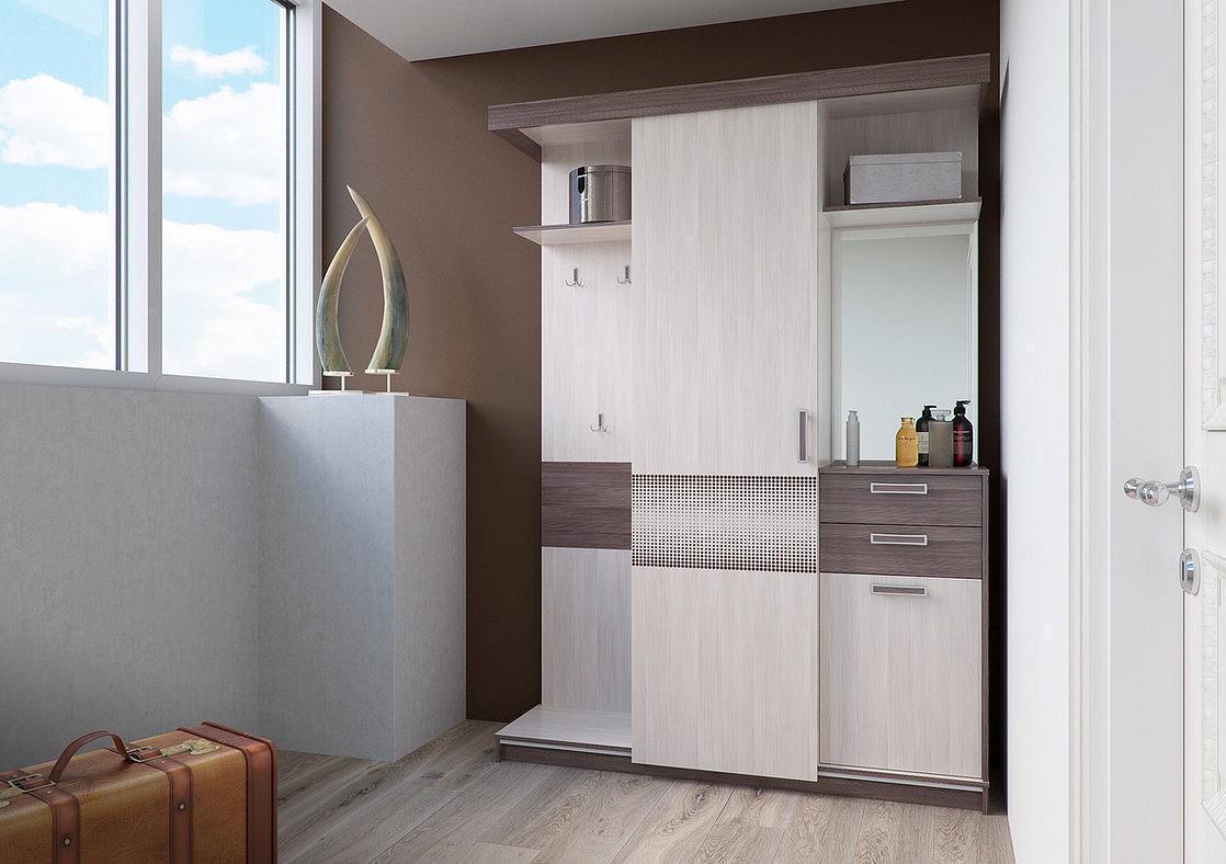 Прихожая «Лорейн» имеет универсальную сборку, оснащена штангой и крючками для одежды, зеркалом, дверью-купе, выдвижными ящиками и вместительными полками.