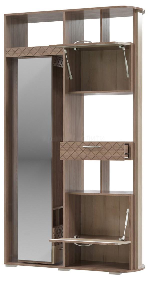 Стенка для прихожей оборудована поворотным механизмом с зеркалом, выдвижными ящиками, открытыми полками и специальными секциями для хранения вещей.