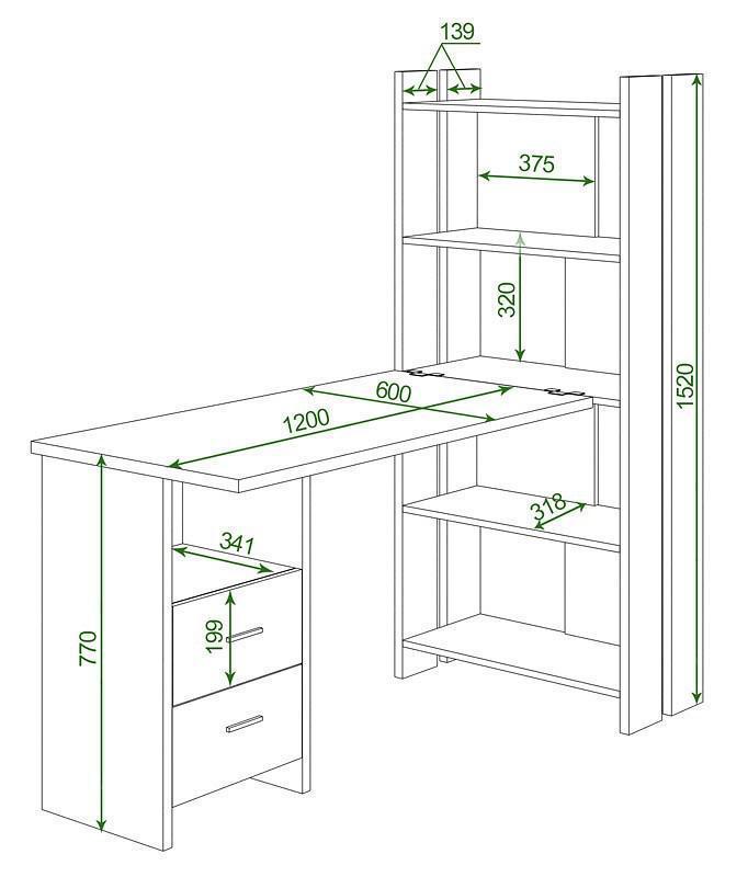стеллаж: 4 полки,тумбочка: 2 ящика