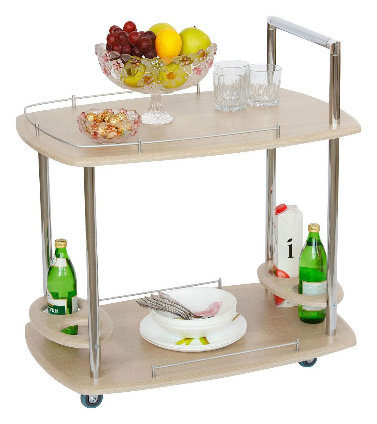 Столик оснащен держателями для бутылок, удобной ручкой и колесами для плавного, бесшумного и легкого перемещения.