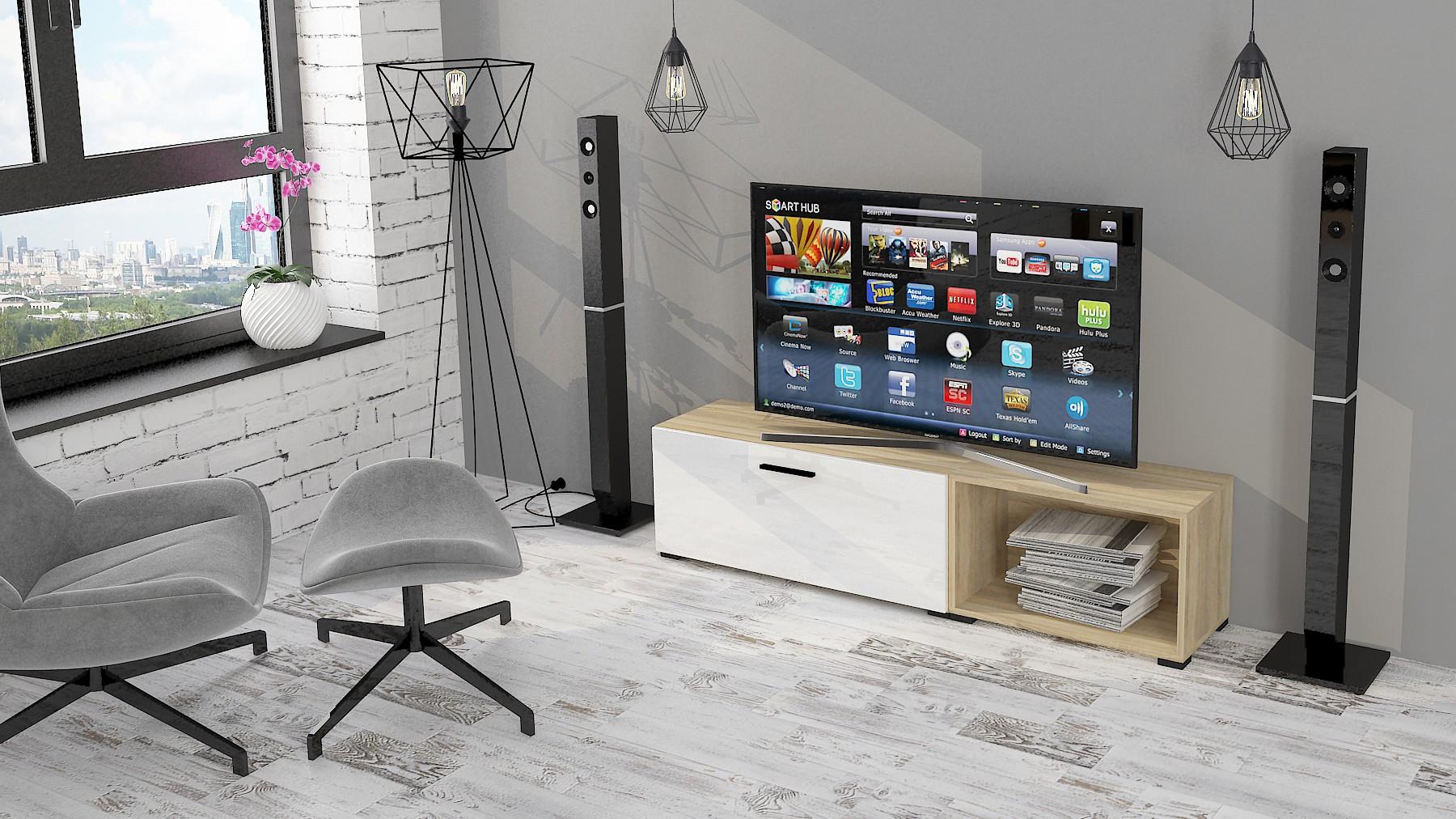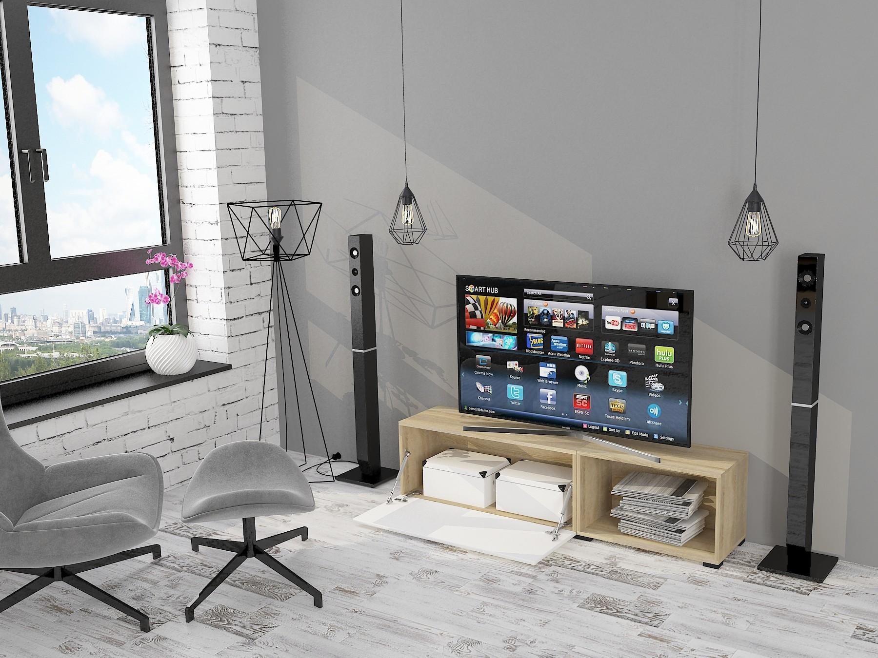 ТВ-тумба сделана из ЛДСП класса Е1 ведущего европейского производителя, фасад из экологичного МДФ, покрыт ПВХ глянцевой пленкой.
