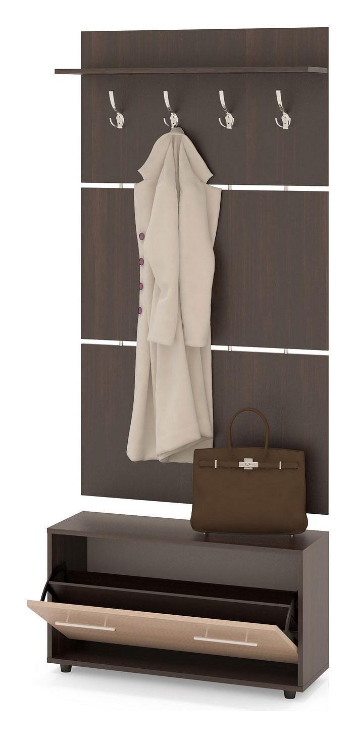 Вешалка состоит из 3-х панелей, соединенных металлическими вставками. На верхней панели есть четыре 3-хрожковых крючка для одежды.
