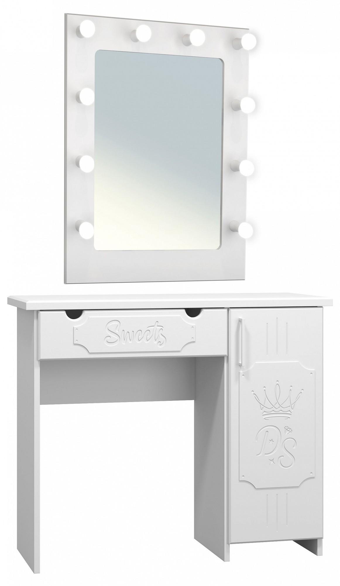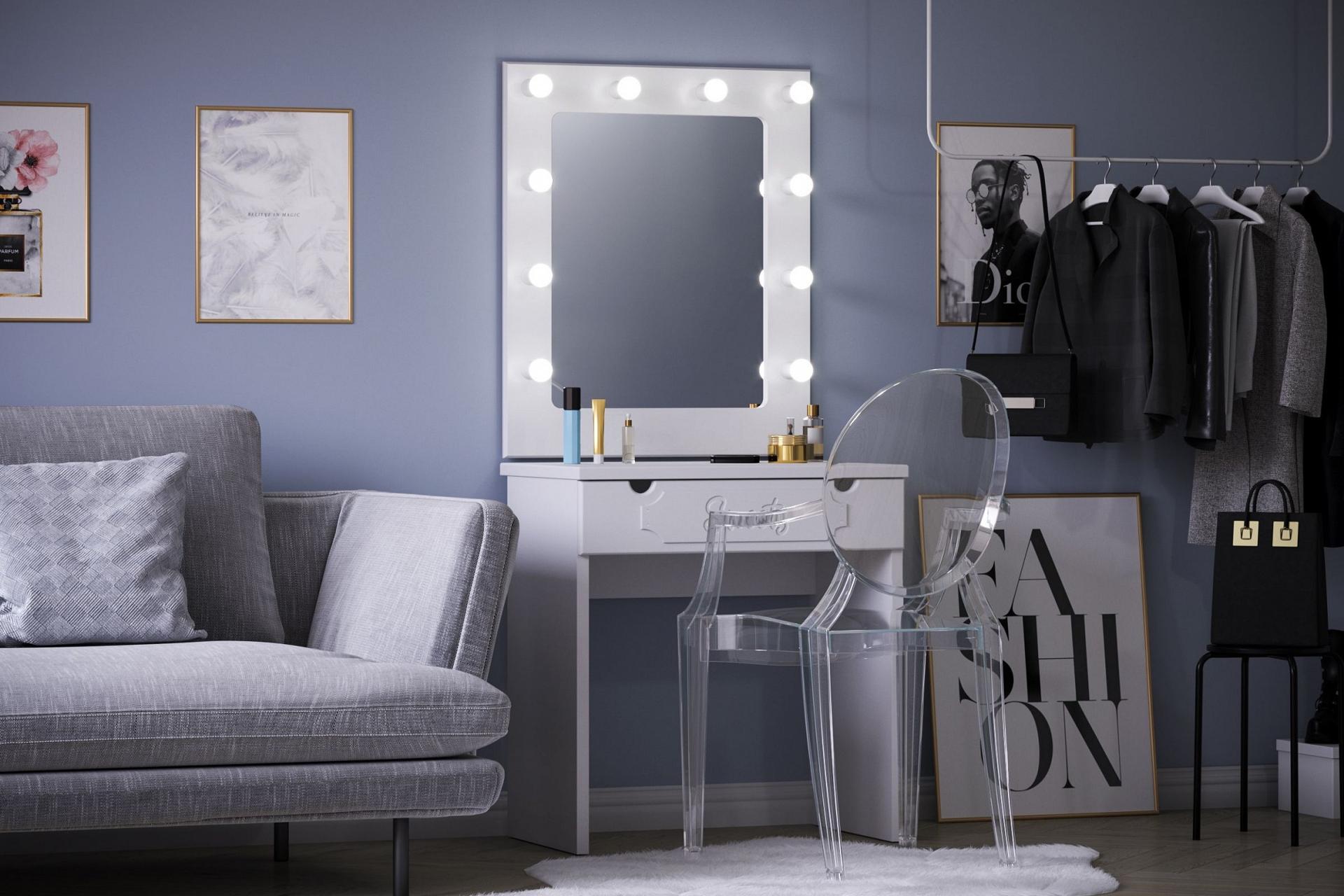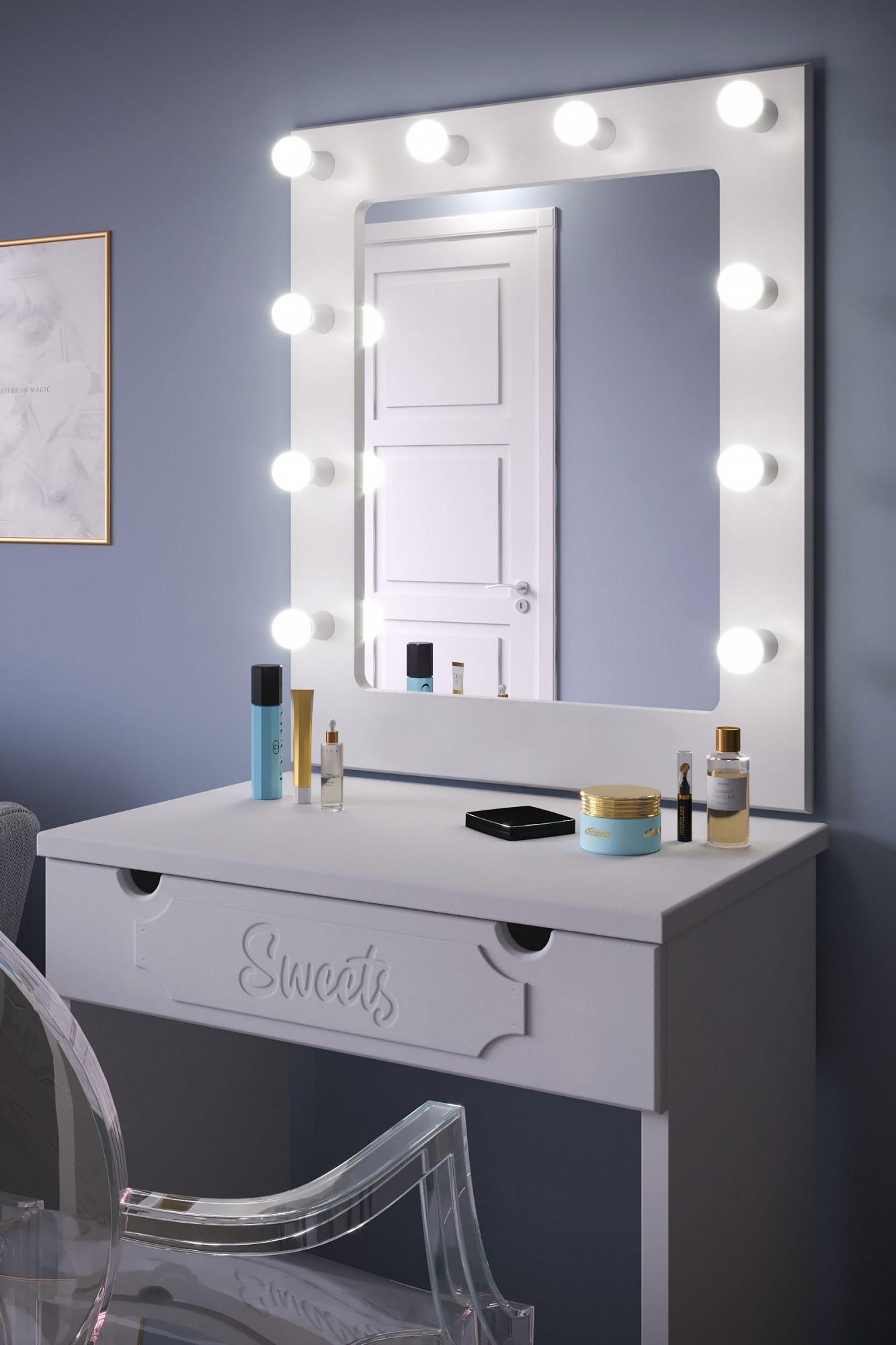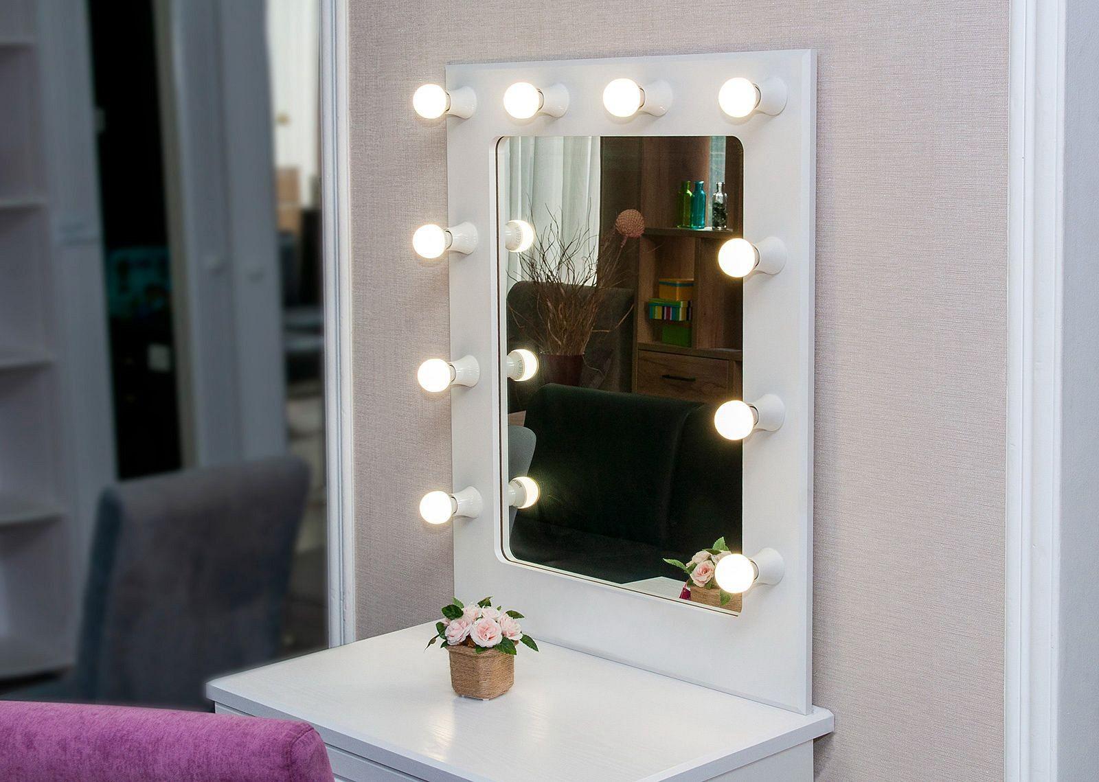 Утонченное косметическое зеркало с лампами, исполненное в оригинальном декоре идеально дополнит интерьер спальни или гостиной.